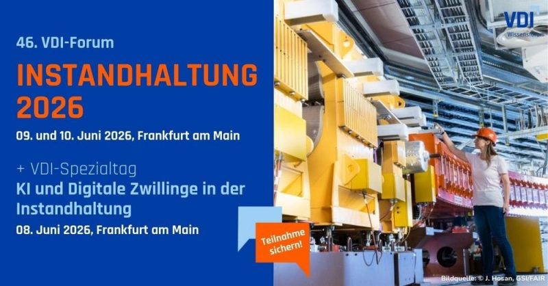 Am 09.–10. Juni 2026 trifft sich die Instandhaltungsbranche in Frankfurt am Main zum VDI Forum Instandhaltung 2026. Die etablierte Fachtagung gilt als zentraler Treffpunkt für Fach- und Führungskräfte aus Industrie, Produktion und Asset Management. Im Fokus stehen wirtschaftliche, praxistaugliche Lösungen für die operative und strategische Instandhaltung – heute und in Zukunft.