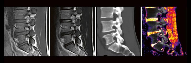 Die Dual-Energy-Computertomographie (DECT) hat für viele klinische Anwendungen bereits Einzug in die Praxis genommen. Für die Behandlung von Wirbelsäulenerkrankungen sind besonders die Darstellung von Knochenmarkveränderungen (z. B. bei osteoporotischen Frakturen) und der Bandscheibe (z. B. bei Bandscheibenvorfällen) interessant und werden intensiv beforscht. Hierdurch versprechen wir uns eine schnellere Therapie für unsere Patienten, weil viele Befund bereits in der CT erhoben werden können, die zuvor nur mit MRT sinnvoll abgebildet werden konnten. Darüber hinaus erhoffen wir uns wertvolle Zusatzinformationen bei degenerativen, traumatischen und entzündlichen Erkrankungen des Achsenskeletts.