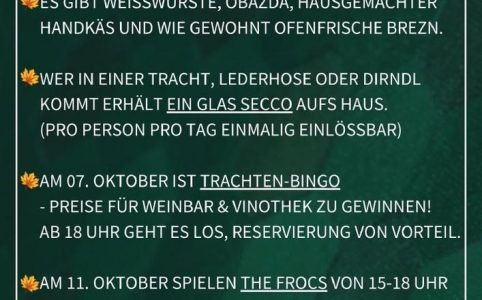 Special: Trachten-Bingo – Preise für Weinbar und Vinothek zu gewinnen! Ab 18 Uhr geht es los, Reservierung von Vorteil. Jeden ers...